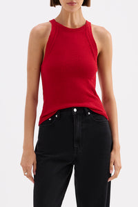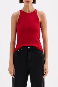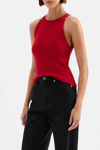 The Kharis Knit Tank is made from a lightweight premium yarn fabrication that has a dry hand feel. This knit tank has a slim fit silhouette and finishes at the hips. Features include knitted fashioning dsign lined around armholes and side seams and ribbed neckline and seam.