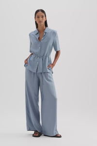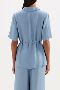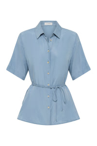 The Lawton Tencel Shirt is made in a lightweight tencel blend fabrication that has a smooth, drapey hand feel. This shirt has a relaxed silhouette, traditional shirt collar, front button opening, shell buttons and a thin rouleau waist tie.