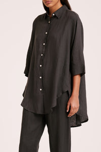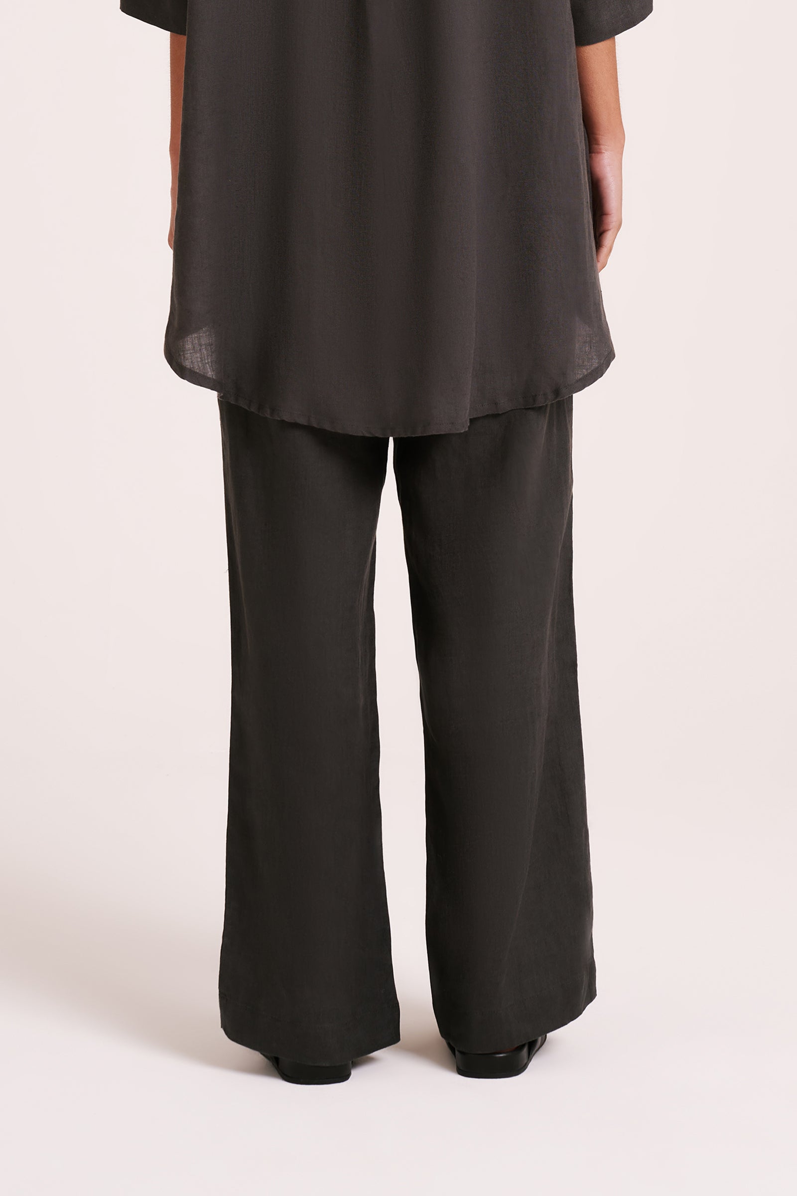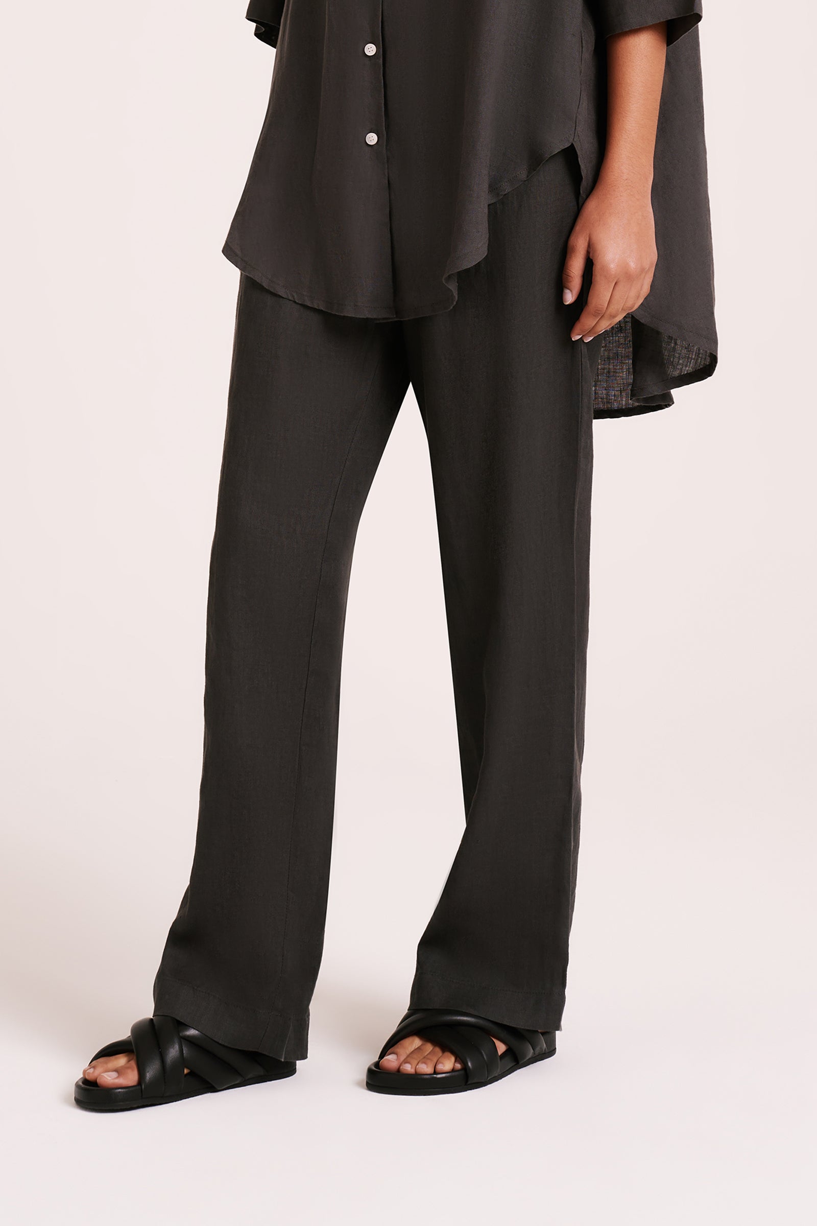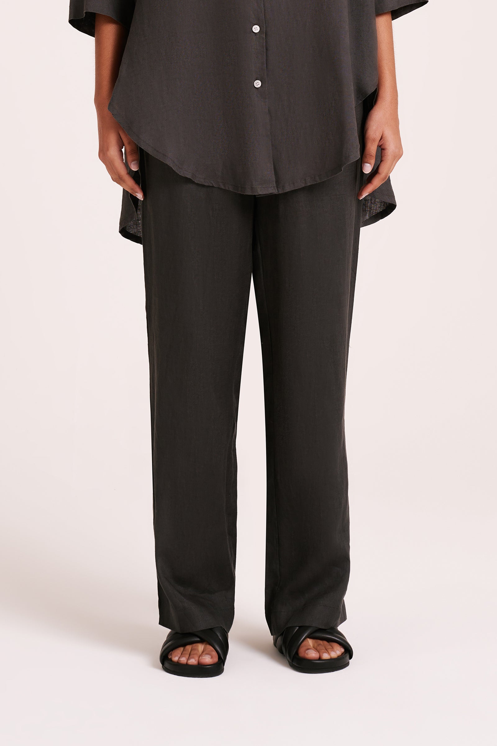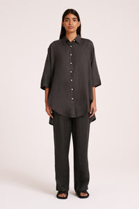 Made in a premium lightweight 100% linen, washed down for a soft and breathable handfeel. The Lounge Linen Longline Shirt is a relaxed, oversized fit with a long billowing hemline and side slits. Features include classic shirt detailing with collared neckline, button front opening, 3/4 sleeves and a Nude Lucy branded label. The Lounge Linen Pant features an elasticated waistband with a button front, side seam pockets and back patch pockets with a Nude Lucy branded label. This full length pant is a relaxed fit. Pair with a Nude Lounge top in coordinating colours.