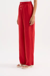 The Lounge Linen Pant silhouette is a clean, casual fit with a wide leg opening. Features include an elasticated waistband with a mock button front, side seam pockets and back patch pockets with Nude Lucy branded label.