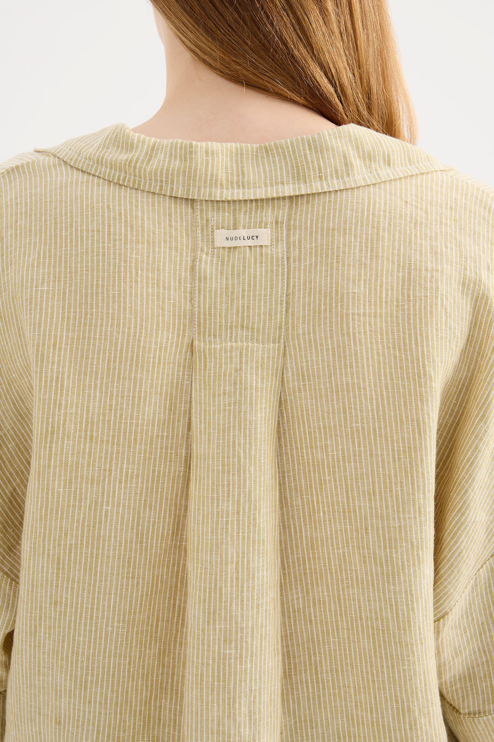 The Lounge Stripe Linen Shirt silhouette is a classic shape, with a clean and casual fit. Features include a wide collared neckline, button front opening and wide elbow length sleeves. This shirt also includes the Nude Lucy branded label.