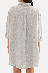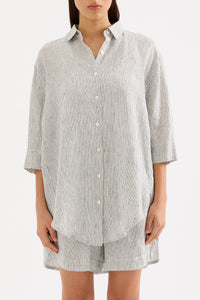 The Lounge Stripe Linen Long Shirt is made in a premium 100% organic French linen which has been washed down for a soft and breathable hand feel. The silhouette is relaxed and oversized with a long billowing hemline and side slits. Features include classic shirt detailing with collared neckline, button front opening, 3/4 sleeves and a Nude Lucy branded label. This Longline Shirt can be worn by itself or paired with a Nude Lounge bottom.