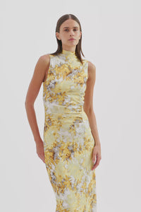 The Lumine Mesh Dress is made from a stretch jersey in our exclusive Lumine print. The silhouette is form fitting with length finishing above the ankles. Features include a raised neckline with soft gathering detail, asymmetric seam detail and ruching at the waist. This dress is fully lined.
