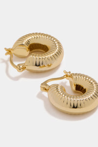 The Maeve Large Hoops is an elevated take on the classic hooped earring. Designed from 18 karat gold plating, these round hoops feature a ribbed texture, latch clasp and are nickel free.
