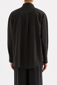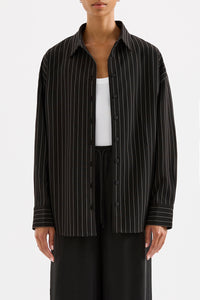 The Maeve Pinstripe Shirt is made from a midweight tailoring fabric which has a smooth handfeel. The silhouette is oversized throughout with length finishing below the hips. Features include traditional shirting details and branded Nude Lucy buttons.