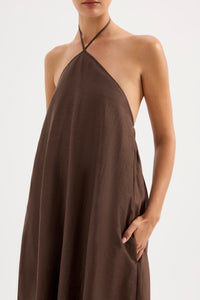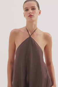 The Margot Maxi Dress is made from a light weight lyocell blend fabric which is slightly sheer and has a smooth hand feel. The silhouette is relaxed with a high triangular halter neckline and full ankle length skirt. Features include a high halter neck and low elasticated back. This dress is fully lined.
