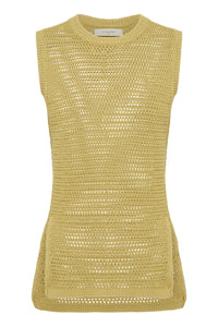 The Marlo Knit Top is made from a viscose blend yarn, with a cool hand feel and an open knit construction. The silhouette is a slim fitting, long line tank shape with length finishing below the hip. Features include a crew neck, angled side seams with splits, a stepped hem and rib construction around neckline, armhole and hem.
