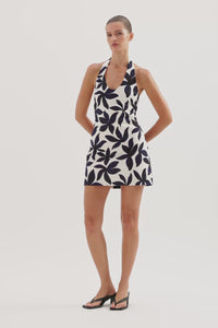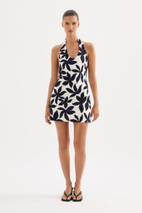 The Odessa Linen Mini Dress is made from a linen blend fabrication in our exclusive Odessa print. This silhouette is slim fitting with an A-line mini skirt. Features include a deep scoop neckline with halter neck straps, invisible side seam zipper and adjustable buttons at back neck.