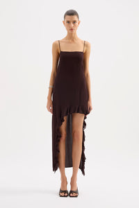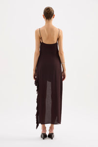 The Omi Maxi Dress is made from a fluid georgette fabrication with a dry handfeel. The slip silhouette drapes softly over the body with an asymmetrical cut out at hem. Features include thin rouleau straps, clean neckline and ruffle hem at leg cut out. This dress is fully lined.