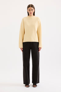 The Ordell Knit is made from a cotton blend textured boucle yarn with a dry and cool hand feel. The silhouette is relaxed with a high neck and length finishing at the hips. Features include a roll hem finish.
