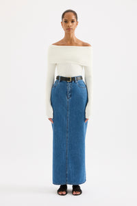 The Organic Denim Maxi Skirt is crafted from 100% organic cotton denim, stone washed to an authentic stone wash blue. It features a mid to high rise, straight silhouette that ends just above the ankles. Details include a branded shank button, rivets, and a back patch. The skirt fits true to size, though sizing up will provide a more relaxed fit.