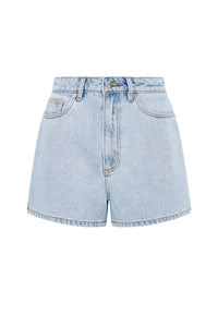 The Organic Mom Short is made from 12 oz 100% organic cotton denim, stone washed to an authentic stone wash blue. The silhouette is a classic high rise with relaxed leg and mini in length. Features include branded shank button, rivets & Jacron Back patch. Fits true to size, size up for a more relaxed fit.