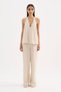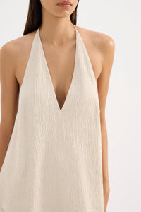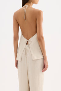 The Palma Halter Top is made from a lightweight textured fabric which has a dry hand feel. The silhouette is a halter neck with an open back finishing at the hip. Features include a low V neckline and thin tie closure. This top is fully lined.