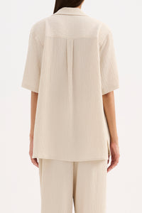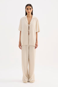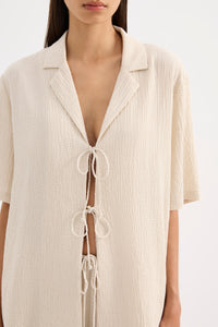 The Palma Shirt is made from a lightweight textured fabric which has a dry hand feel. The silhouette is an oversized fit, with length finishing below the hip. Features include classic shirting details, front tie closure and slits at hem.