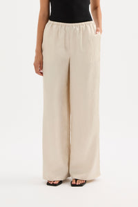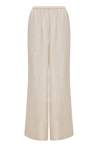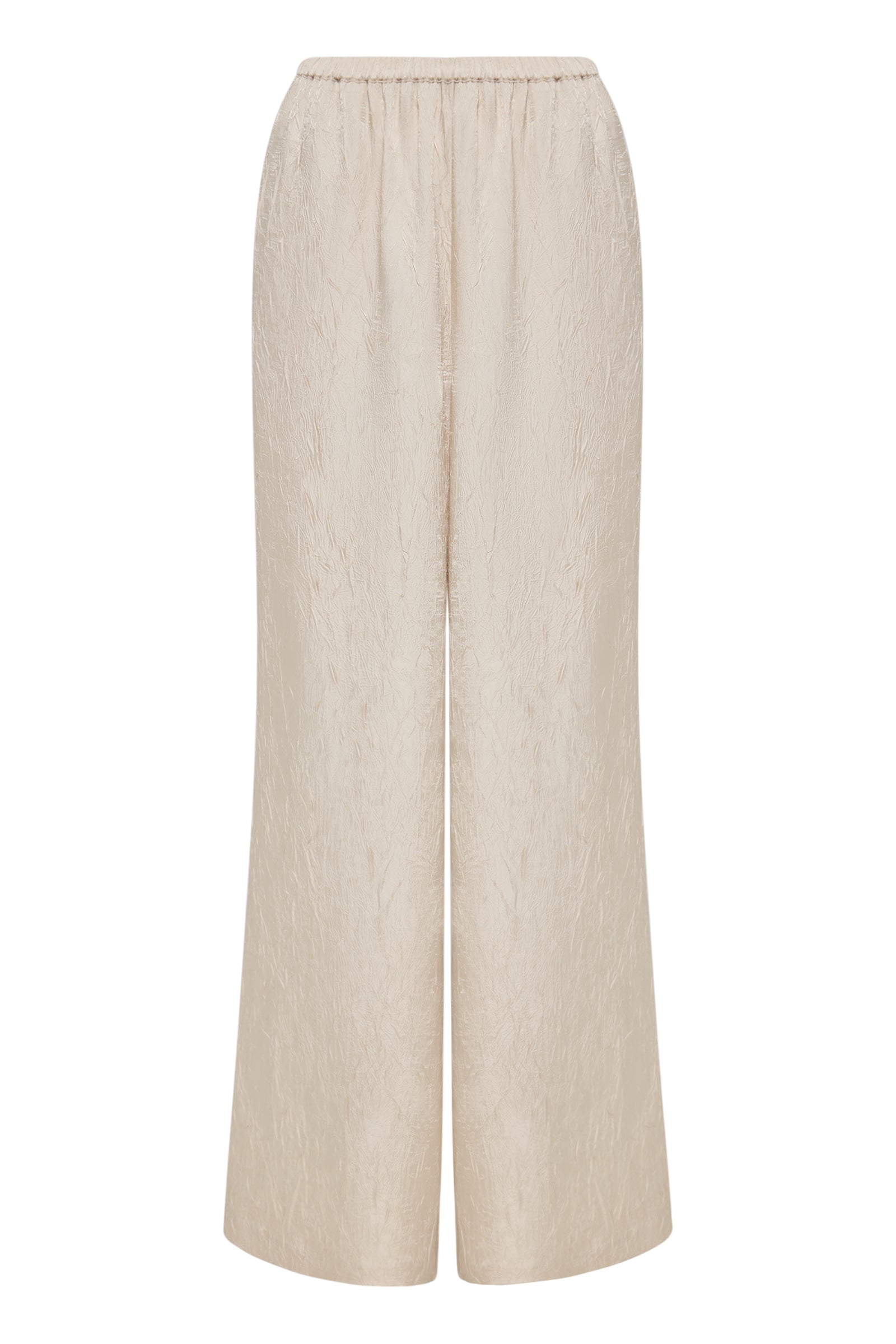 The Pandora Pant is made from a premium crushed satin featuring a luminous, gloss finish and subtle texture. The silhouette is relaxed with a wide full length leg. Features include an elasticated waistband and side seam pockets.