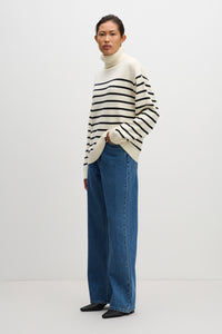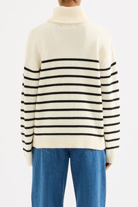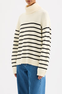 The Perri Turtleneck is made from a cotton blend yarn with a soft hand feel. The silhouette is relaxed with a dropped shoulder, and length finishing below the hips. Features include fold over turtleneck, placement stripe design, ribbed collar, cuff and hem.