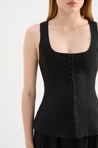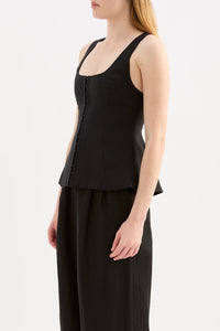 The Quinn Linen Vest is made from 100% linen which has been washed for a soft, breathable hand feel. The silhouette is tailored and slim fitting with a front opening. Features include a scooped square neckline, hook and eye opening and back peplum. This vest is fully lined.