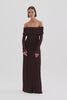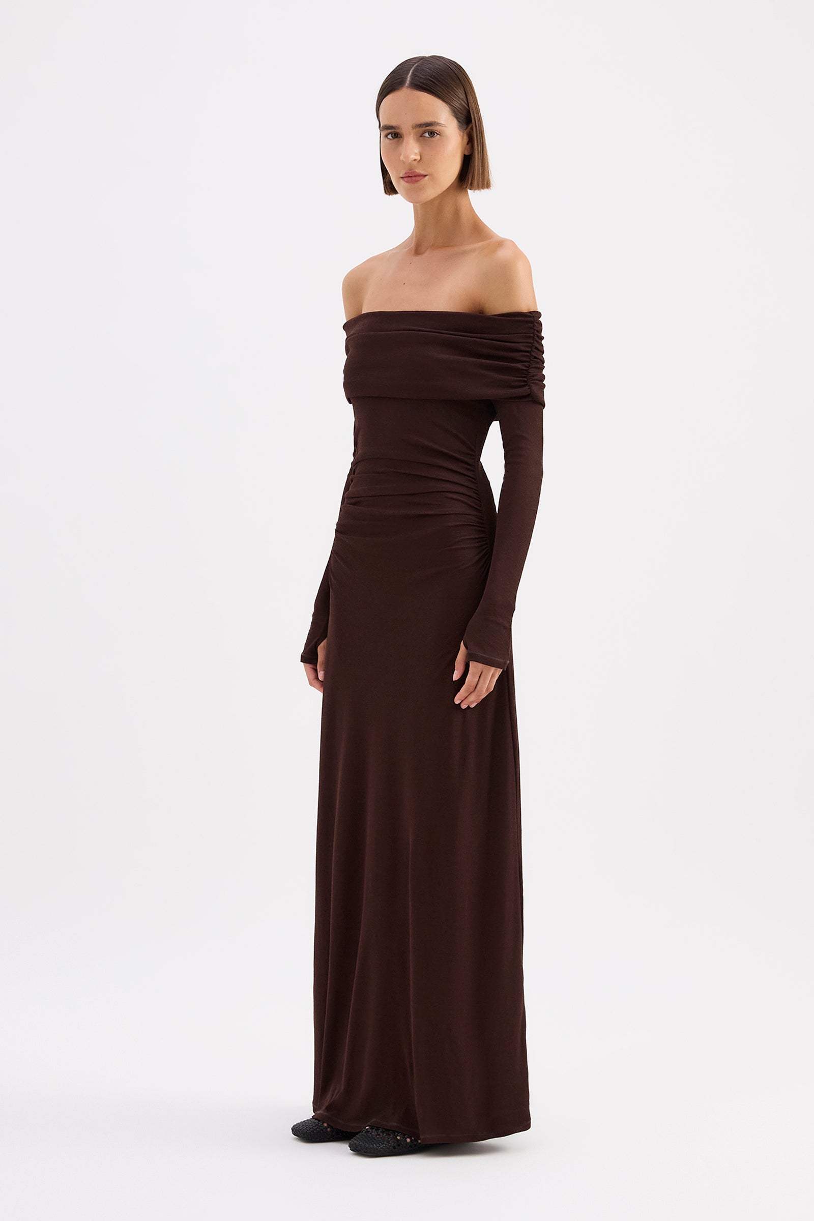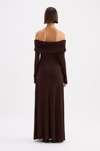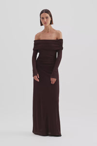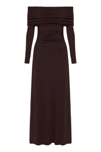 The Rue Mesh Long Sleeve Dress is designed from a stretch jersey fabrication that has a dry, lightweight hand feel to provide a comfortable fit. This long sleeve dress is off the shoulder and has a maxi length silhouette. Features include a fold over neckline, draping through body and across bust and thumb holes. This dress is fully lined.