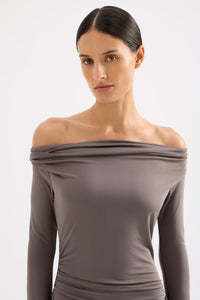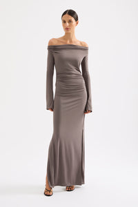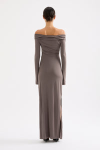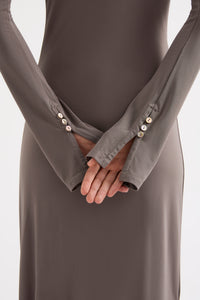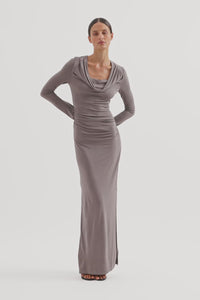 The Sefa Maxi Dress is made from a premium stretch jersey fabrication which has a dry handfeel and a nice drape. The silhouette is slim fitting with long sleeves and a maxi length. Features include a low cowl neckline and organic draped gathers at waist and hips, splits at sleeve hem with shell buttons and splits at side seams.