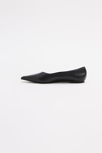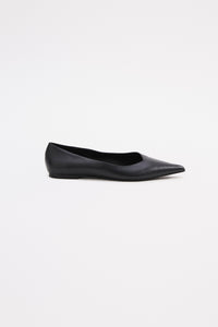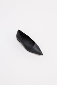 The Sonnet Pointed Flat features an asymmetric V-cut topline and a sharply pointed toe. Crafted in matte Nappa leather, it’s finished with a low, flat heel for an elegant, modern shape for work to weekends.