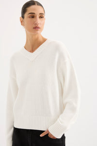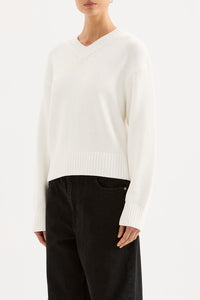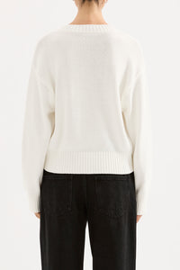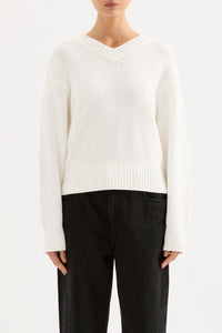 The Tara Knit is made from a midweight cotton yarn which has a solid, dry hand feel. The silhouette is relaxed with drop shoulder and long sleeves. Features include a v-neckline and rib at neckline, hem and sleeve cuff.
