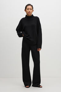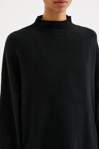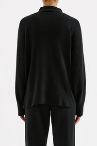 The Taylor Knit is made from a midweight yarn which is super soft and has a subtle fluffy texture. The fit is oversized with length finishing at the hips. Features include a raised neckline with a roll finish, and soft ribbed cuffs and hem.