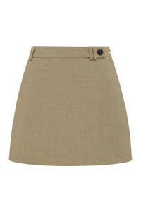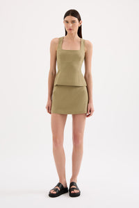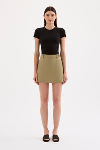 The Thea Mini Skirt is designed with a mid weight tailoring fabrication with a smooth, structured hand feel. This mini length skirt is high waisted and has a tailored waistband with off centre extension and button detailing. An invisible zipper in side seam is also included.