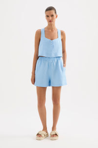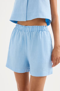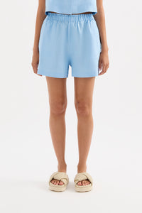 The Theo Linen Short is made from 100% Linen which has been washed for a soft, breathable hand feel. The silhouette is a high waisted clean casual fit with a wide leg opening. Features include an elasticated paper bag waistband and side seam pockets.