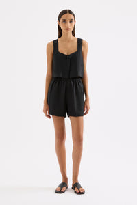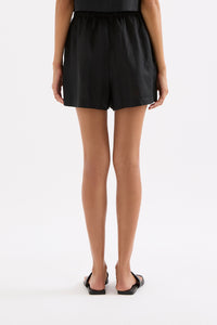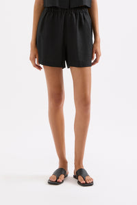 The Theo Linen Short is made from 100% Linen which has been washed for a soft, breathable hand feel. The silhouette is a high waisted clean casual fit with a wide leg opening. Features include an elasticated paper bag waistband and side seam pockets.