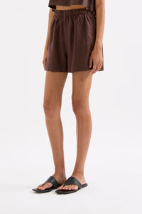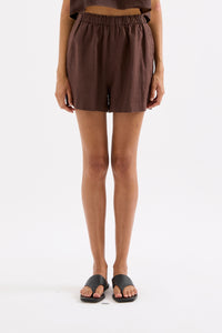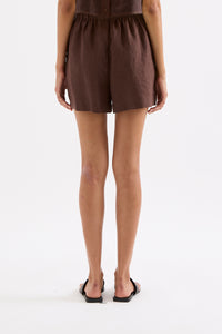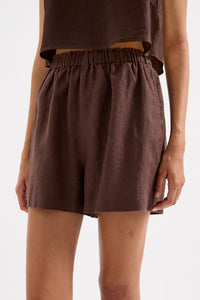 The Theo Linen Short is made from 100% Linen which has been washed for a soft, breathable hand feel. The silhouette is a high waisted clean casual fit with a wide leg opening. Features include an elasticated paper bag waistband and side seam pockets.