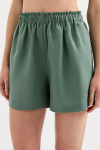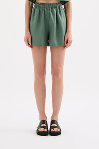 The Theo Linen Short is made from 100% Linen which has been washed for a soft, breathable hand feel. The silhouette is a high waisted clean casual fit with a wide leg opening. Features include an elasticated paper bag waistband and side seam pockets.