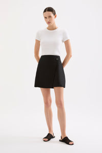 The Thilda Linen Mini Skirt in white is made from 100% linen which has been washed for a soft, breathable hand feel. The silhouette is high waisted and mini in length. Features include mock wrap front panel, mock shell button and invisible zipper at back. This skirt is fully lined.