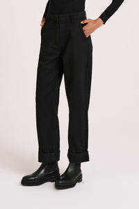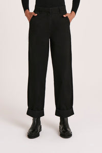 The Tobi Pant is made from a mid weight cotton twill. Silhouette is high rise with a straight leg finishing at ankle length. Features include functioning fly fronts, classic belt loops and pockets at sides and back, and cuffed hem.