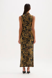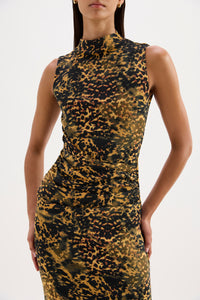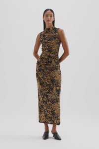 The Tora Mesh Dress is designed in our exclusive Tora print from a stretch jersey fabrication that has a dry, lightweight hand feel. The silhouette is form fitting finishing above the ankles. Features include a sleeveless shape, raised neckline and asymmetric draping through body. This dress is fully lined.