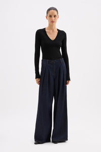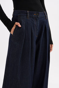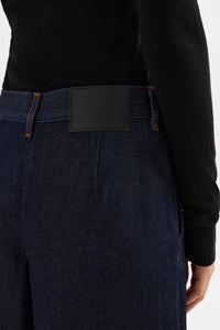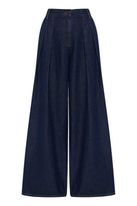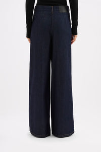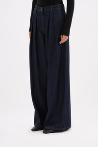 The Vita Denim Pant is made from a premium denim fabrication and washed to a deep blue. The silhouette is high waisted with a wide leg and features front pleats, side seam pockets, branded shank button, fly opening and a branded jacron patch. Style with the matching Vita Denim Overshirt for a matching ensemble.