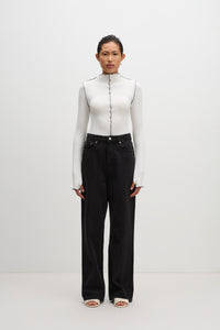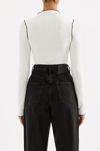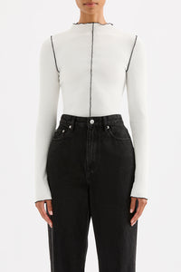 The Xander LS Top is made from a lightweight textured fabric that is stretchy and soft on the skin. The silhouette is a close fitting with length finishing at the hips. Features include a raised neckline, long fitted sleeves, and contrast baby locked neckline, centre front seam and hems.