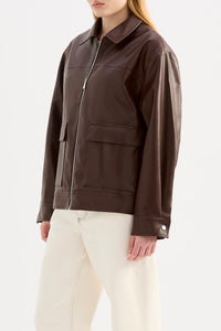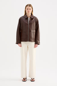 The Yaz Faux Leather Jacker is made from a luxe PU fabrication and has a smooth, buttery finish. The silhouette is relaxed with a drop shoulder and length finishing above the hips. Features include zipper opening and patch pockets.