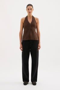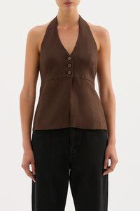The Zayda Linen Vest is made from 100% premium linen with a breathable, soft hand feel. The silhouette features tailoring details and is designed with a halter neck, v neckline, button front opening and back neck button adjustors.