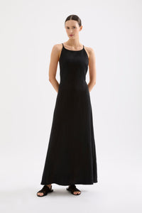 The Ziba Linen Maxi Dress is made from a premium linen which has been washed for a smooth, soft hand feel. The backless silhouette is feminine with a fitted waist and full skirt finishing at ankle length. Features include a high neckline, thick straps, pockets at side seams and elasticated waist at the back.