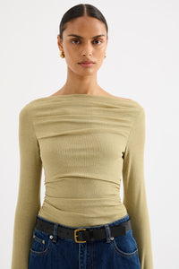 The Ziel Off Shoulder Top is made from a stretch jersey which has a dry hand feel. The silhouette is fitted with long sleeves and length finishing above the hips. Features include a high off shoulder neckline, thumbholes and organic gathering and tuck detailing.